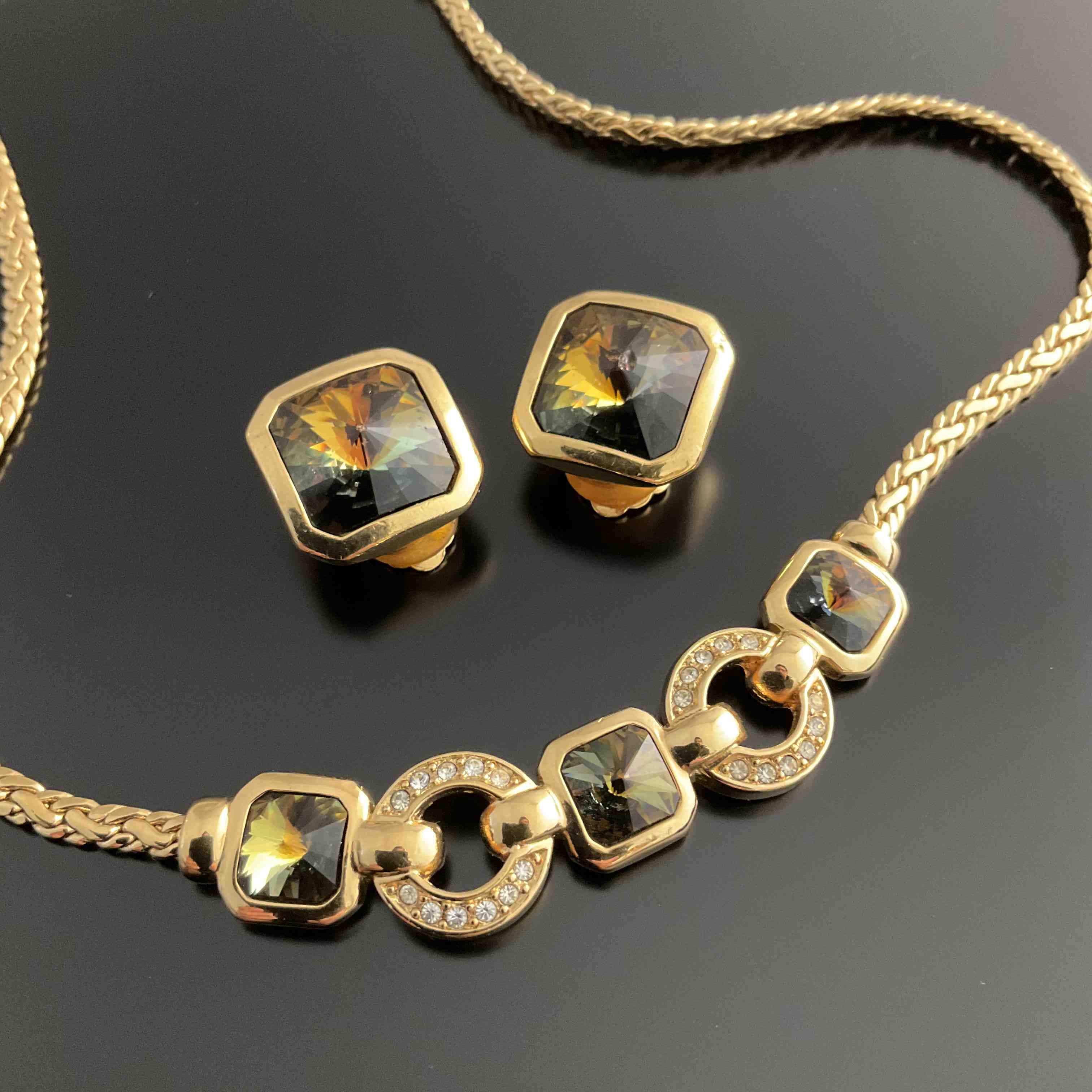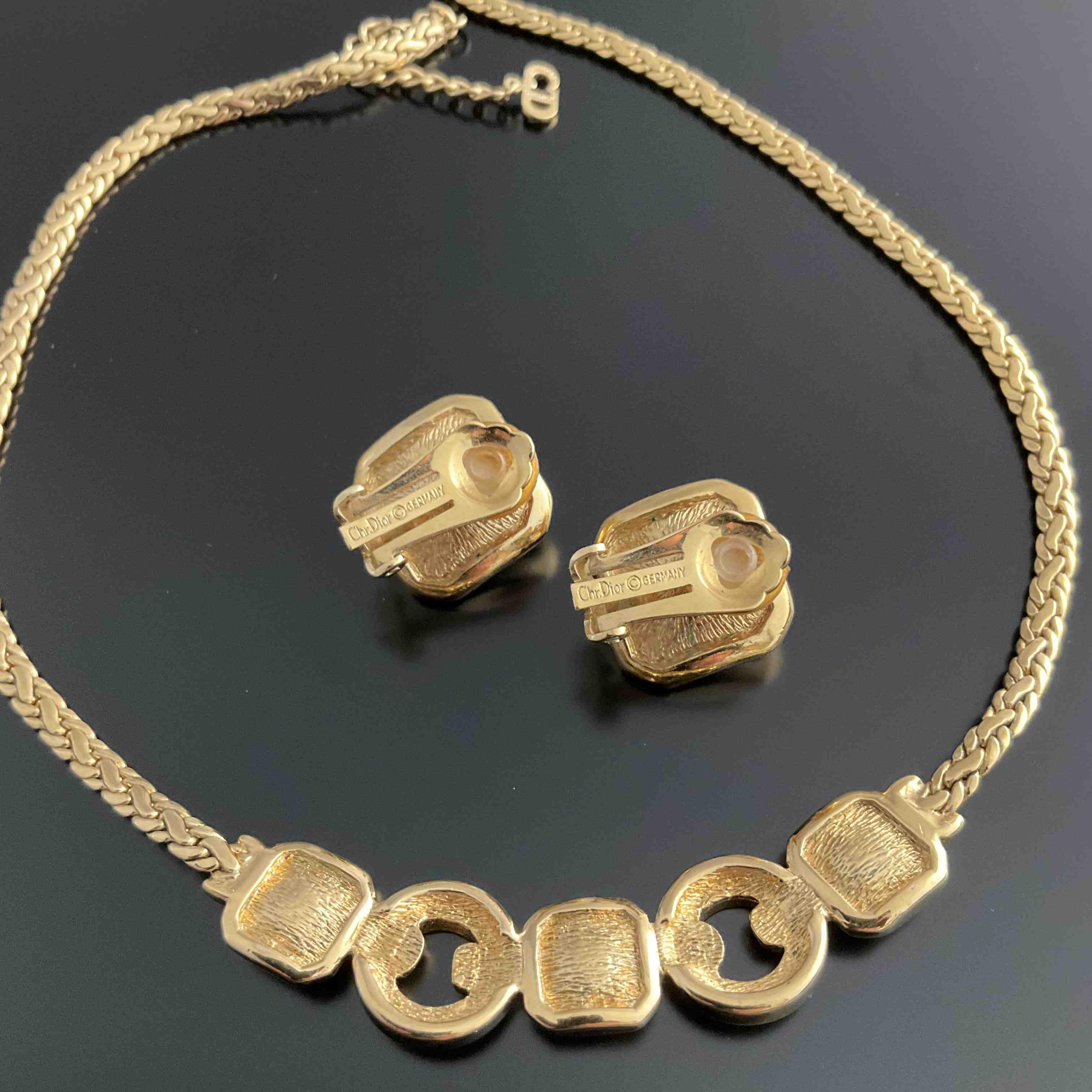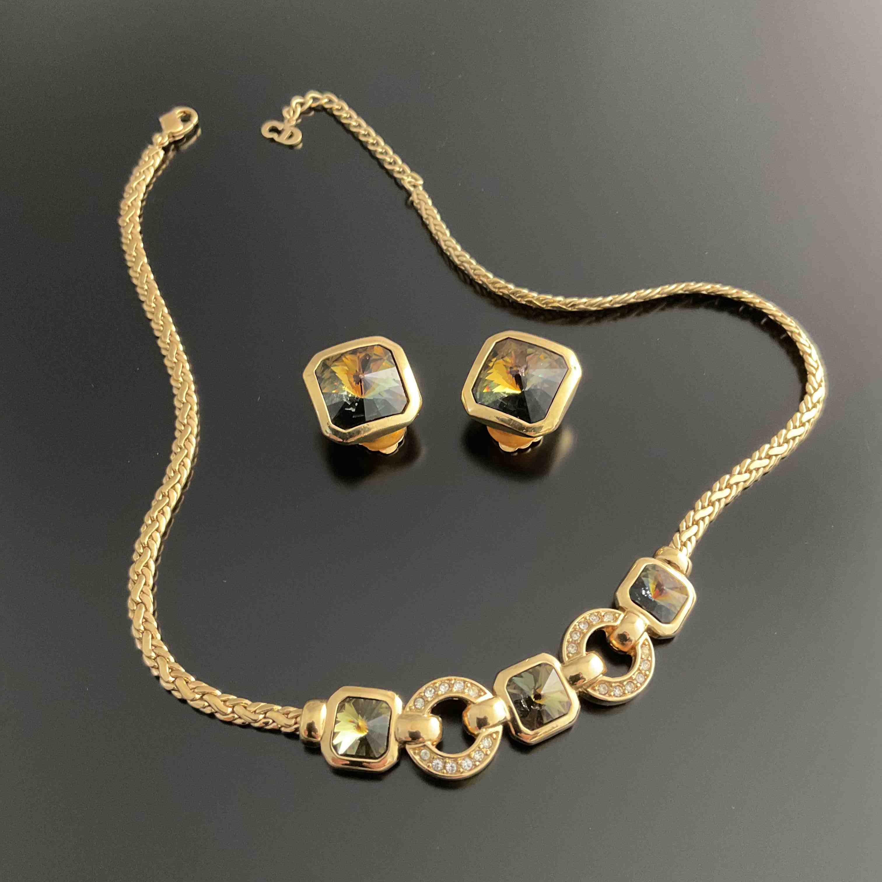 DIOR. PARURE en métal doré ornée de cristaux de forme pyramidale à pans. Elle se compose d'un COLLIER et d'une paire de CLIPS D'OREILLES.