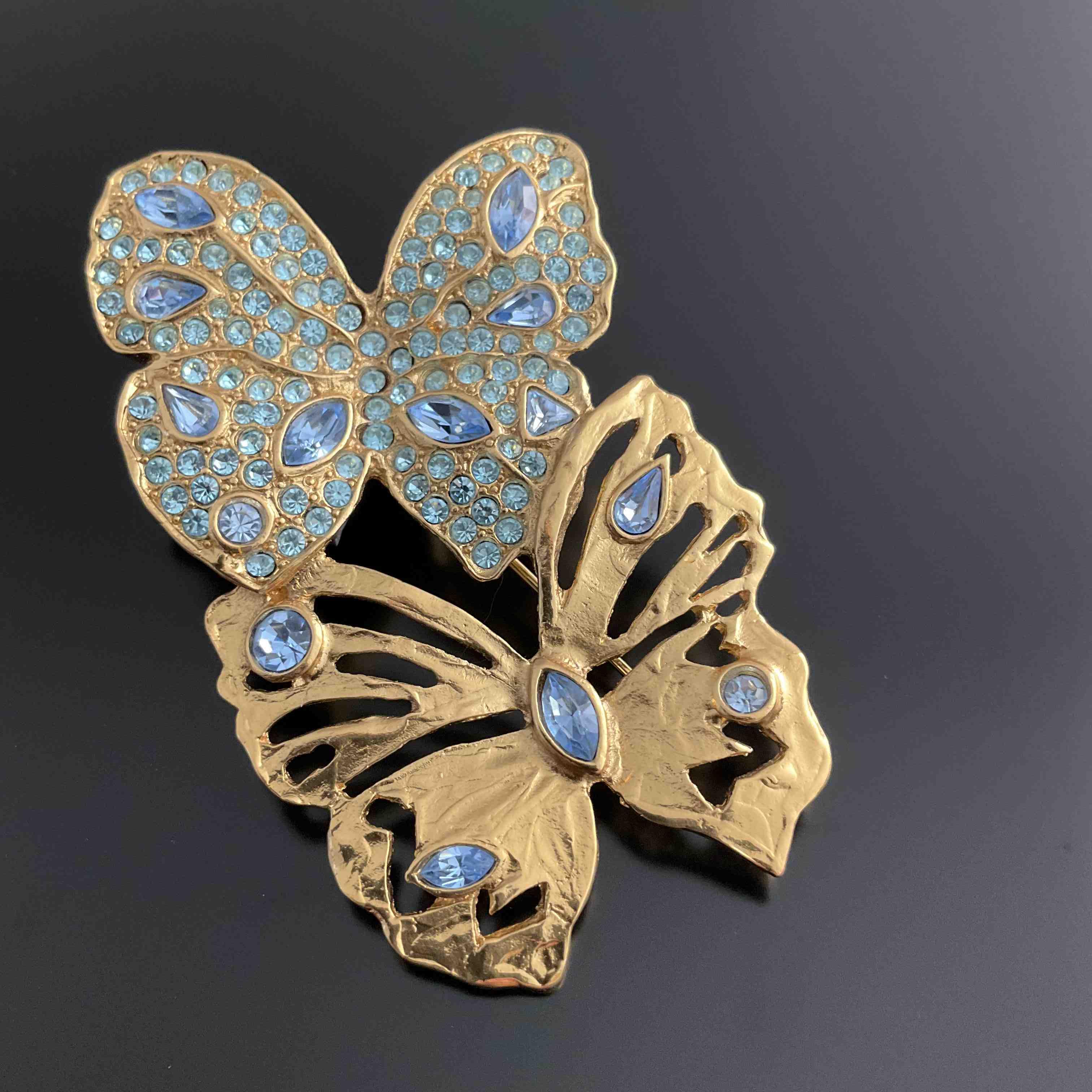 YVES SAINT LAURENT. BROCHE en métal doré figurant deux papillons en vol ornés d'imitations de pierres précieuses bleues.