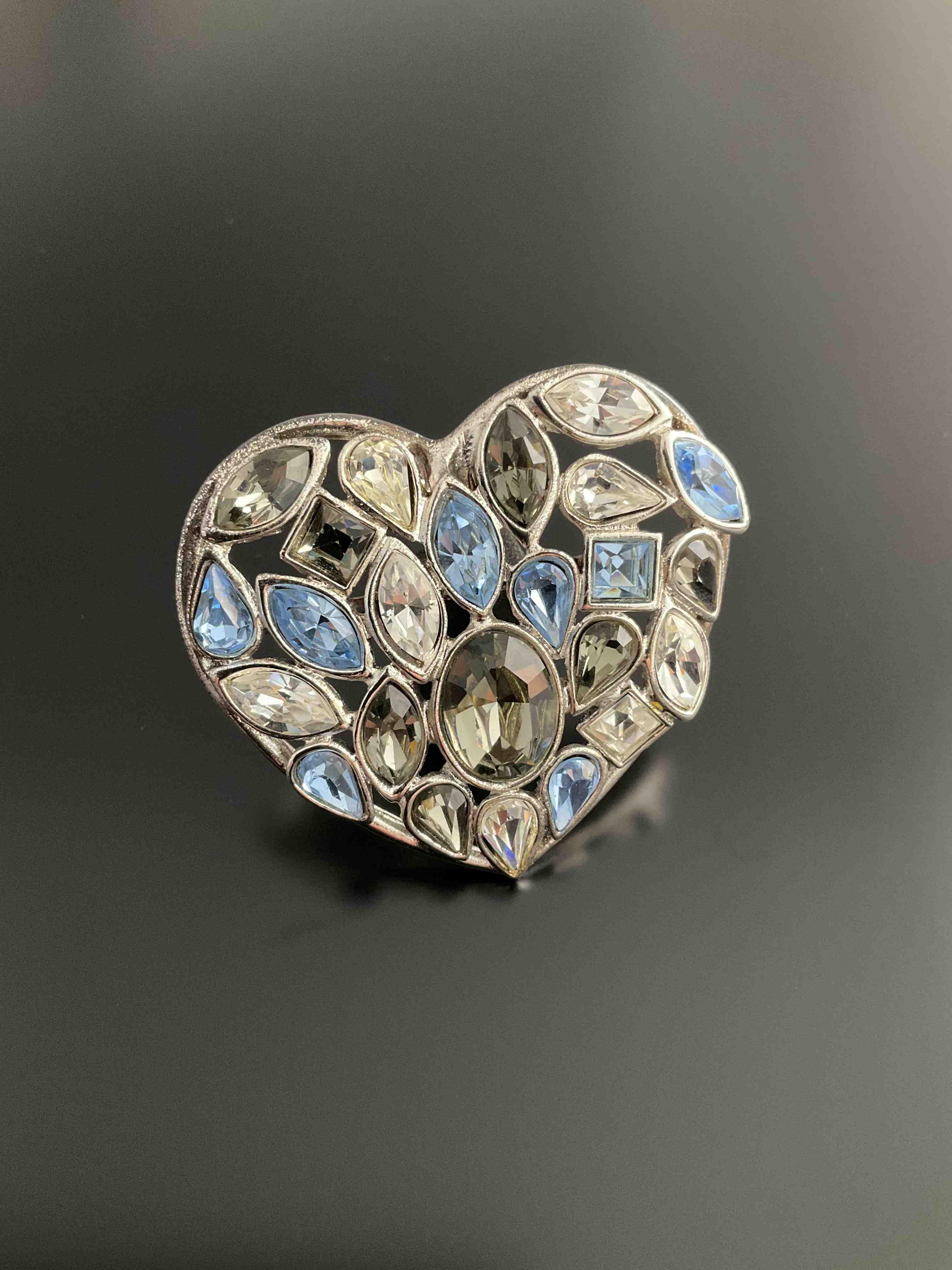 YVES SAINT LAURENT. BROCHE en métal argenté figurant un coeur agrémenté d'imitations de pierres précieuses bleues, blanches et fumées.