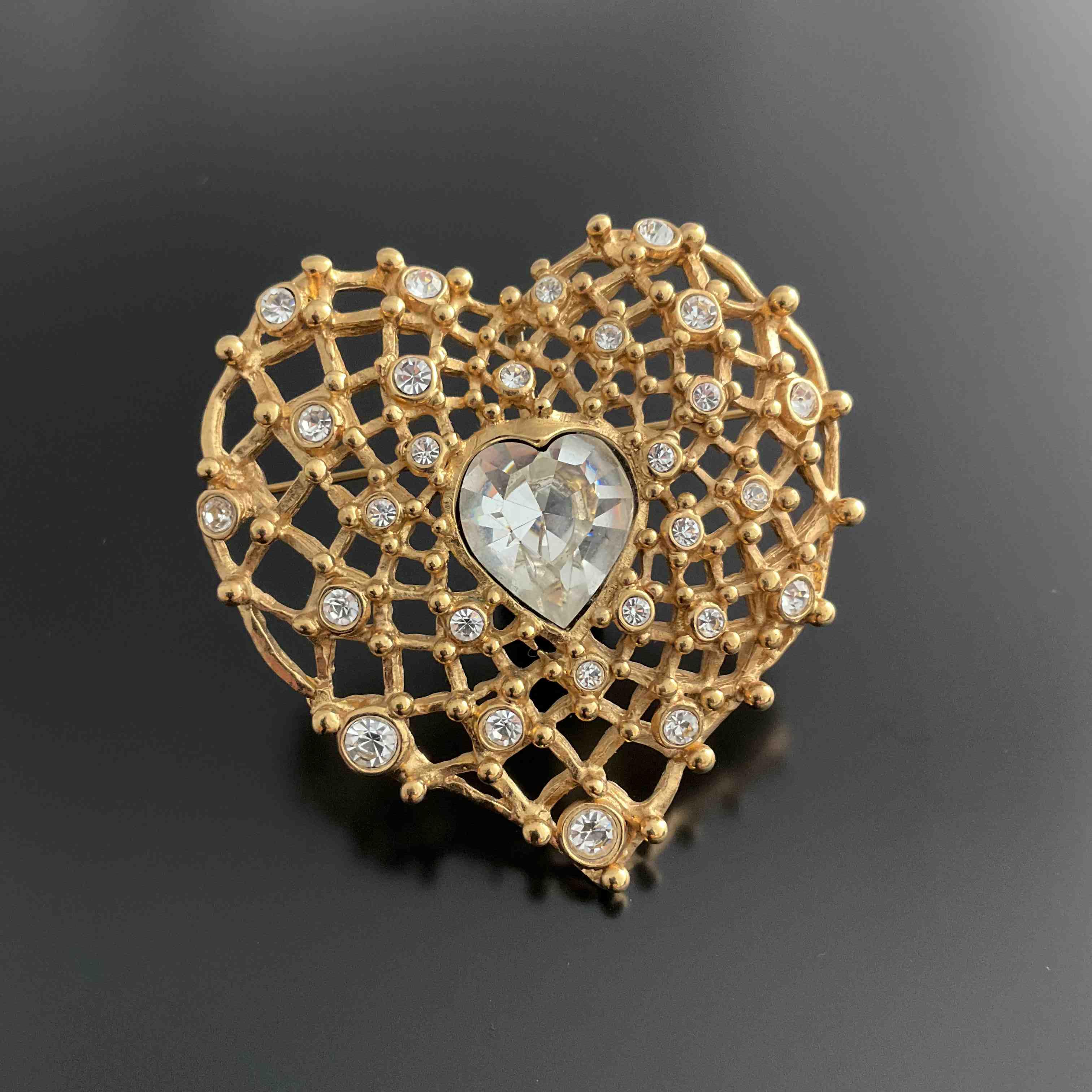 YVES SAINT LAURENT. BROCHE en métal figurant un coeur ajouré de croisillons et ornée d'imitations de diamants.