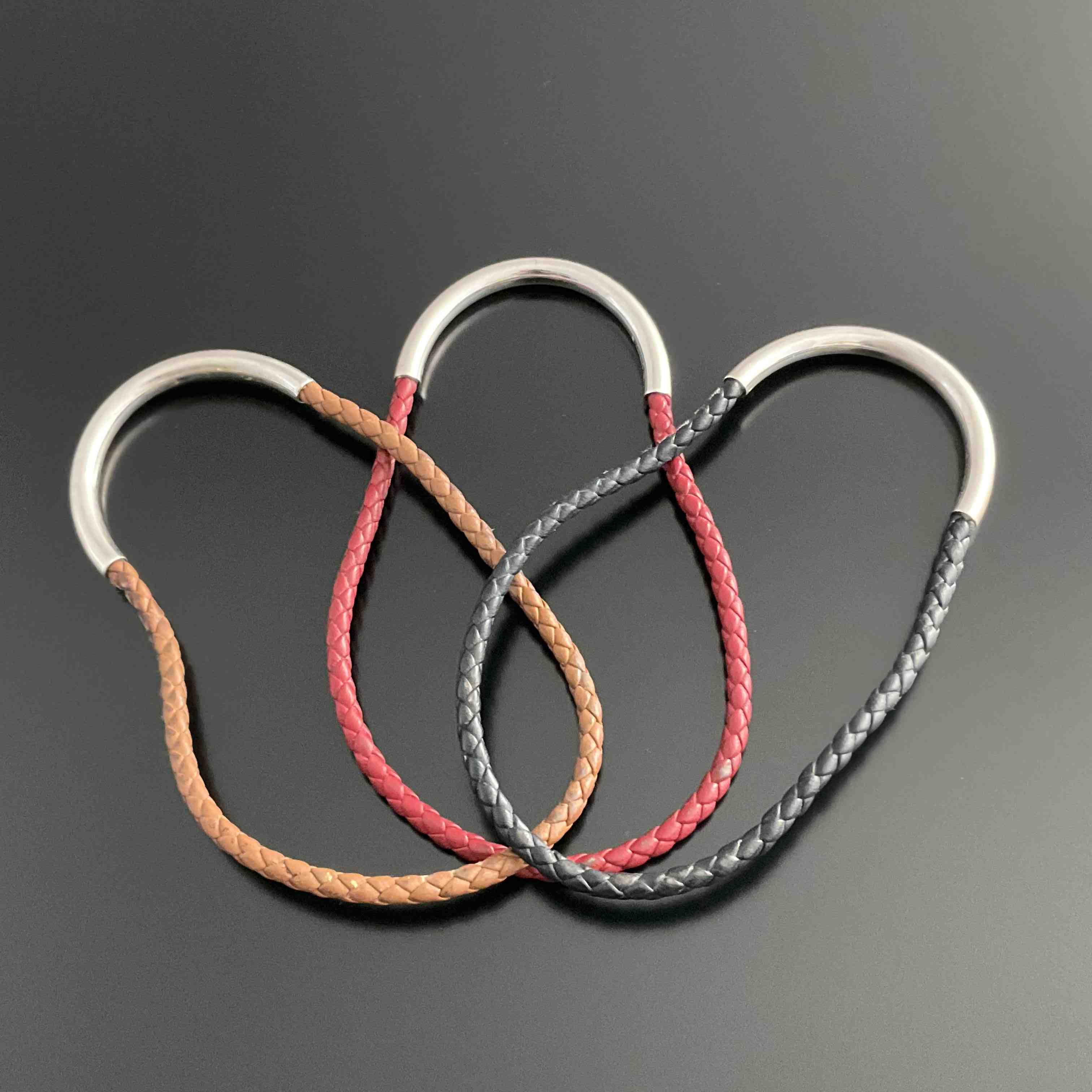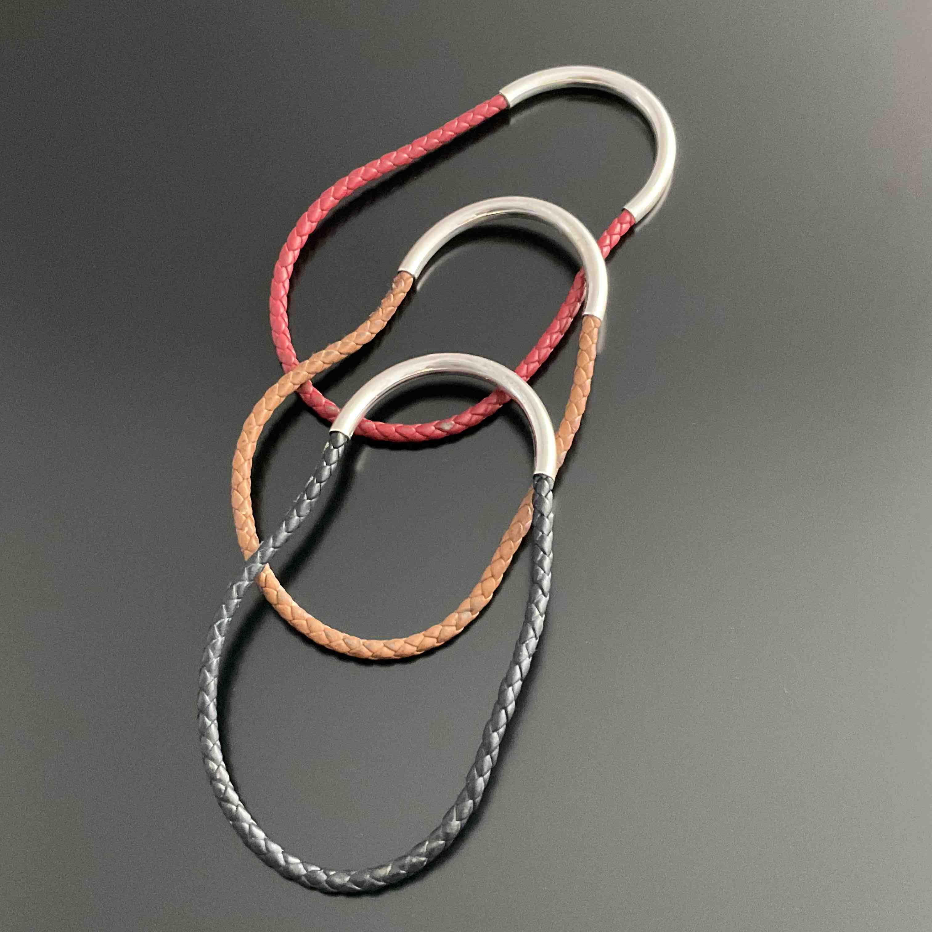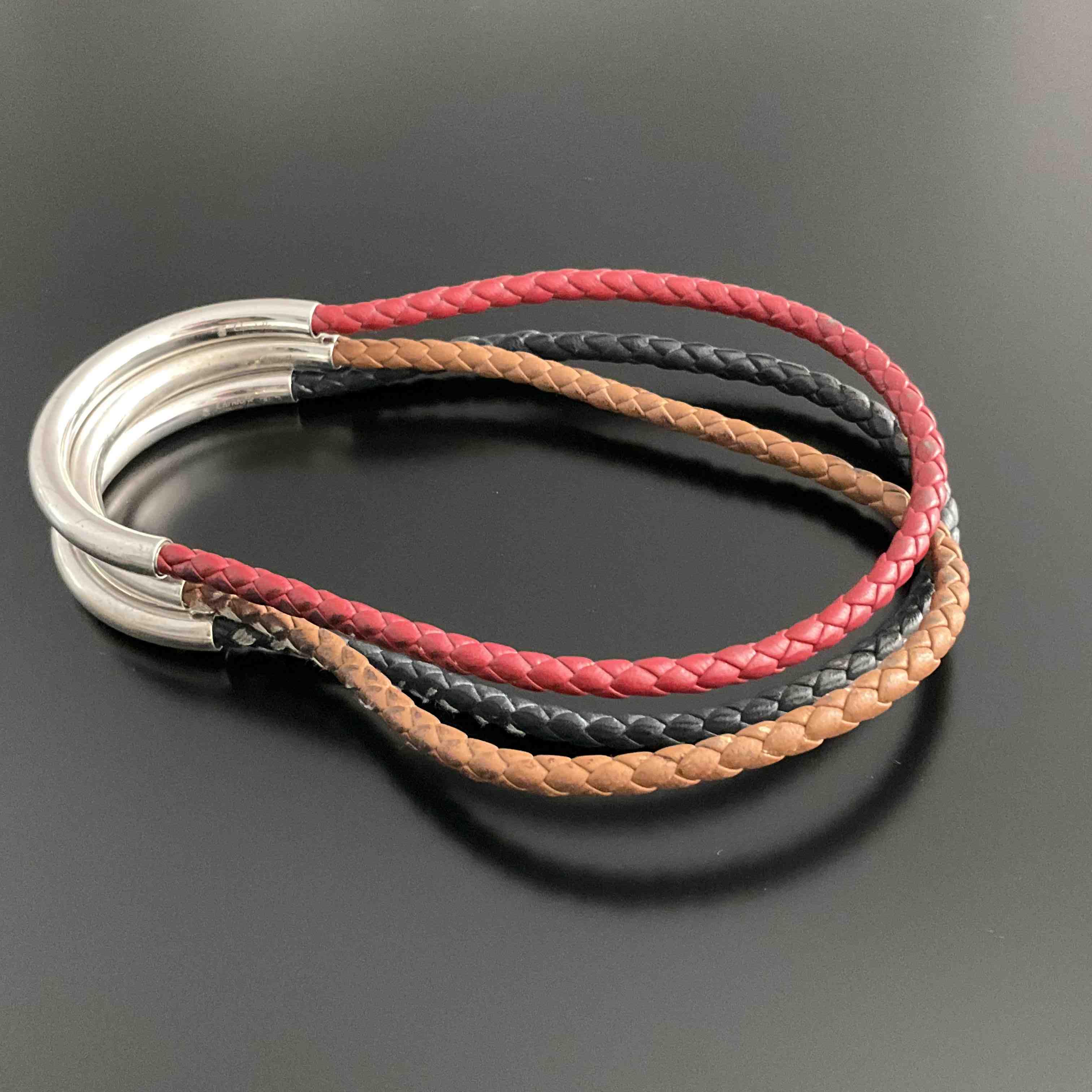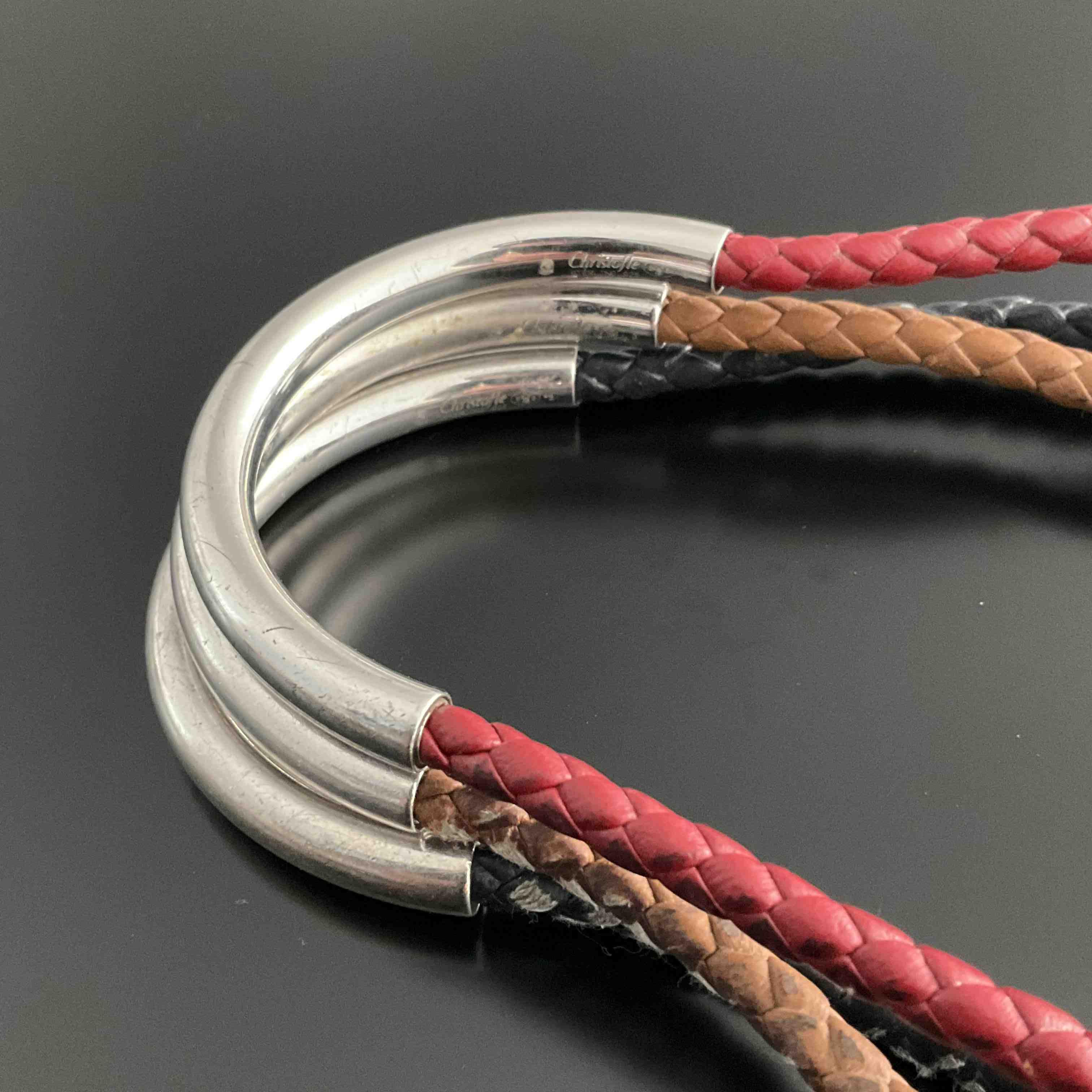 CHRISTOFLE. Réunion de TROIS BRACELETS double-tour, modèle "Duo", en tissu gainé de cuir tressé et argent. Un bleu marine, un rouge et un camel.