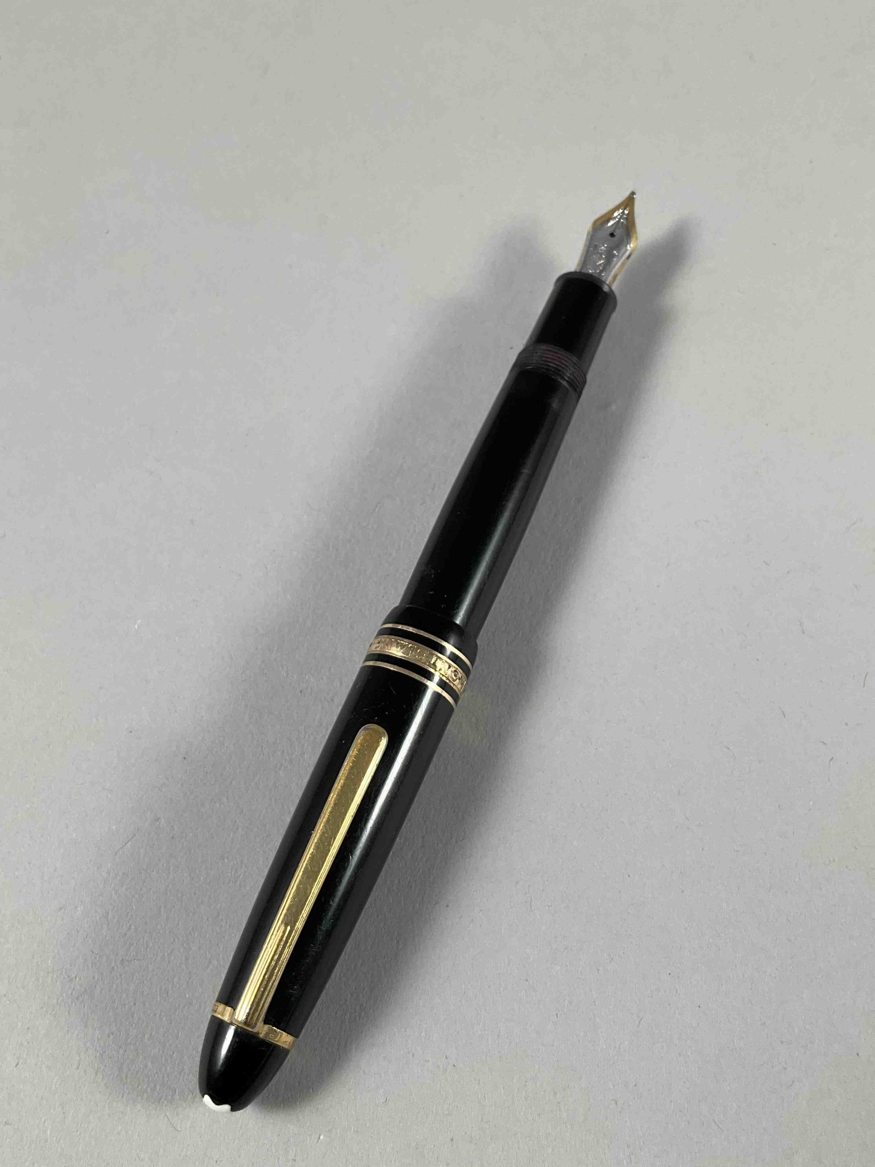 MONTBLANC. STYLO-PLUME "Meisterstück". Corps en résine noire, les attributs en métal doré. Plume en or jaune et blanc 18k. Numéroté. Recharge à cartouches.