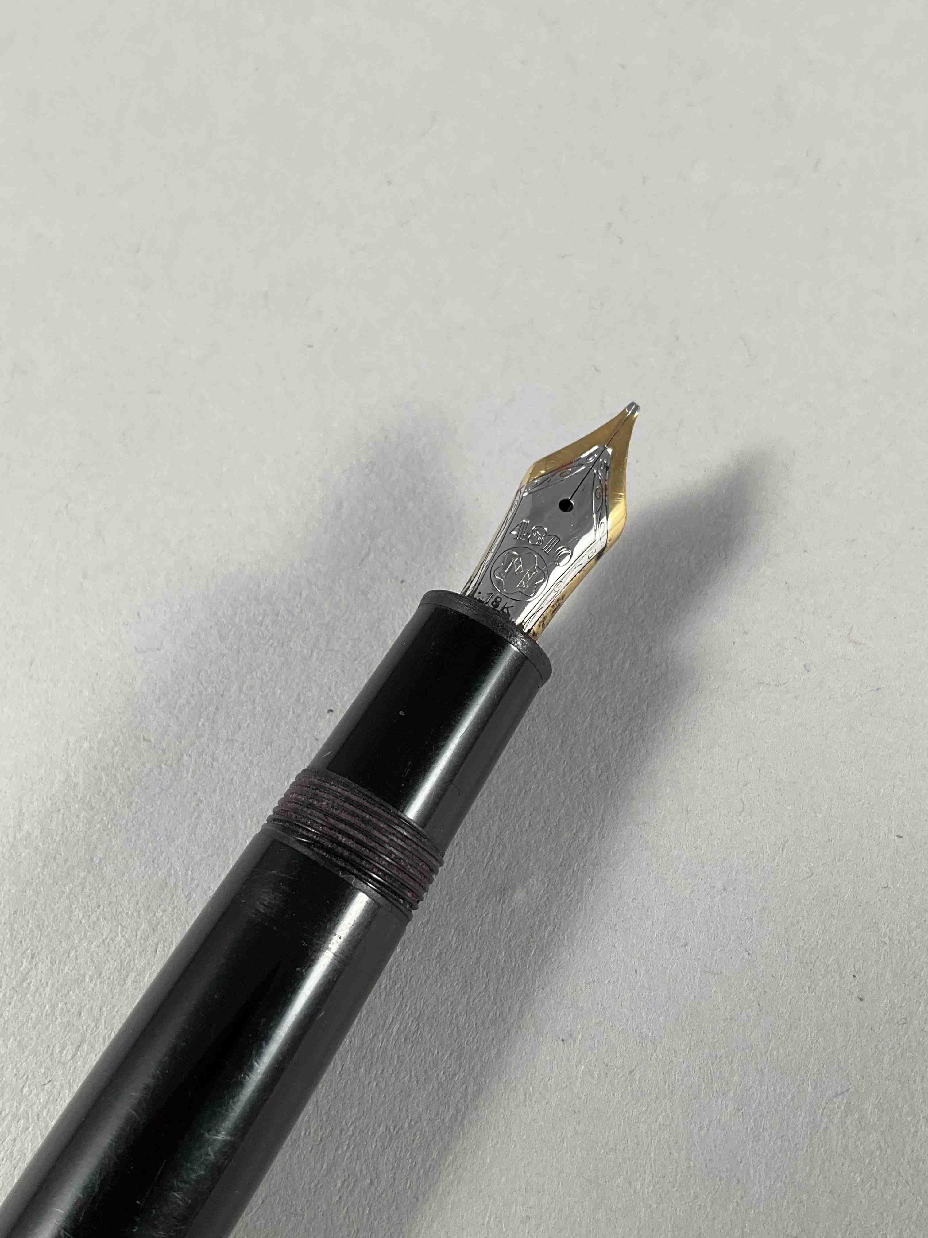 MONTBLANC. STYLO-PLUME "Meisterstück". Corps en résine noire, les attributs en métal doré. Plume en or...