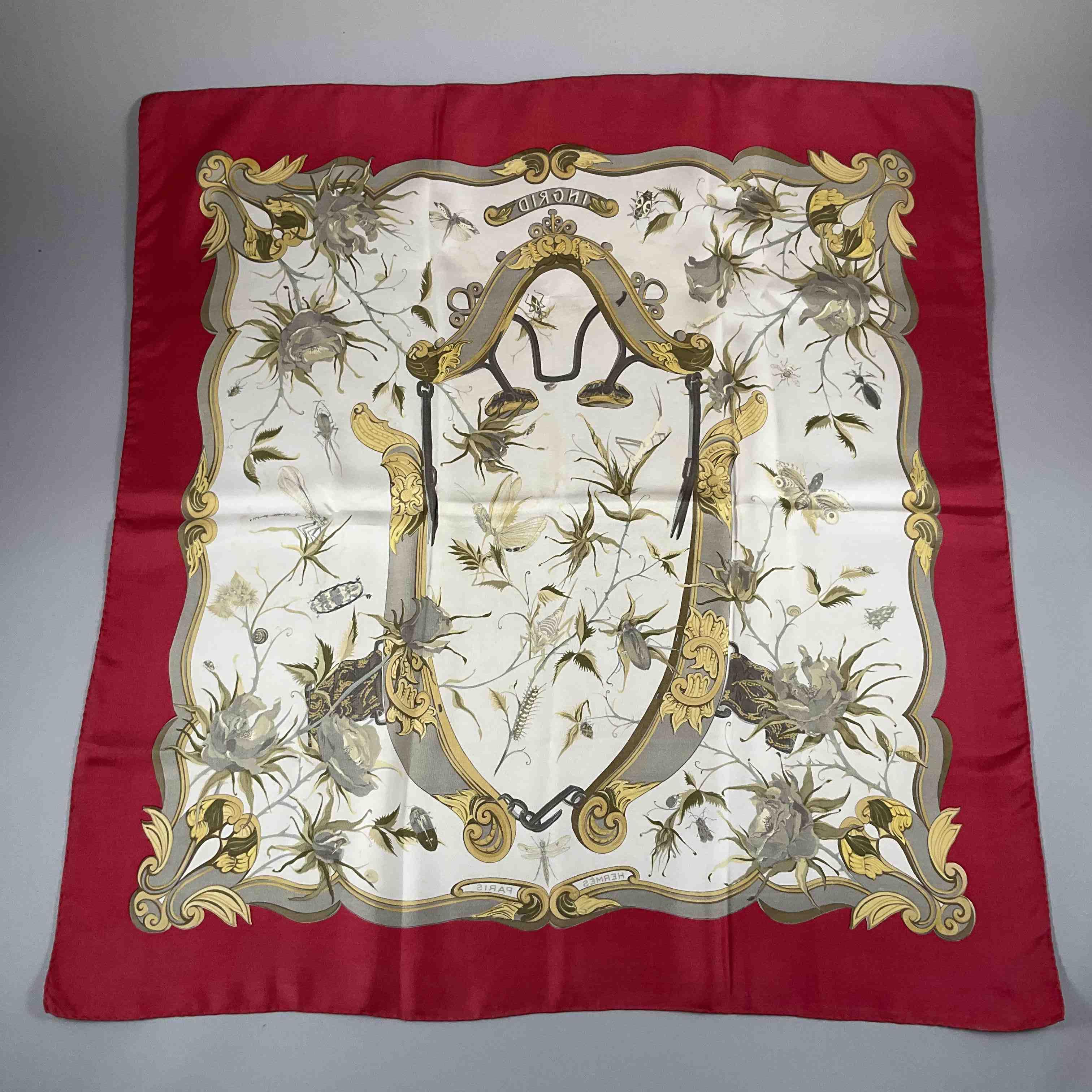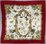 HERMES."Ingrid".Carré de soie imprimée à fond crème et bordure rouge bordeaux.Hauteur : 90 cm. Largeur : 90 cm. (Quelques taches).