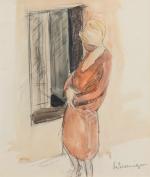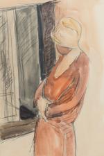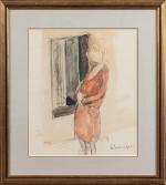 Maurice LE SCOUEZEC (Le Mans, 1881 - Douarnenez, 1940). Femme au chapeau cloche à la fenêtre. Aquarelle...