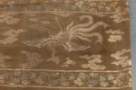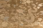 Lampas, fond satin jaune vieil or, décor broché en soie crème et bleue d’un dragon à cinq griffes, perle enflammée, nuages, entre quatre dragons. Sous une frise figurant un dragon à cinq griffes et deux phénix. Rubans floraux en haut et en bas.