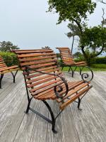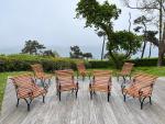 SALON DE JARDIN, sept pièces, en fer forgé relaqué noir et lattes de bois résineux. Il se compose de quatre fauteuils et de trois chaises à dossier renversé. Les fauteuils présentent des accotoirs à crosse.