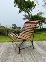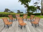 SALON DE JARDIN, sept pièces, en fer forgé relaqué noir et lattes de bois résineux....
