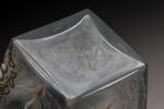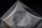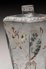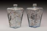 Deux FLACONS de section carrée évasée en verre soufflé à décor japonisant gravé et émaillé polychrome et or. Sur une face, une marine en grisaille est inscrite dans un demi-cercle. Les autres côtés accueillent quant à eux fleurs et feuillages stylisés dans un élégant jeu de gravures satinées ou brillantes et émaux en léger relief. Une frise de végétaux à l'épaulement. Petit col circulaire orné en suite accueillant un bouchon bombé (manque un). Signés en dessous à l'or "Emile Gallé déposé" avec une tige trifoliée pour le premier et "E. Gallé déposé" pour le second.