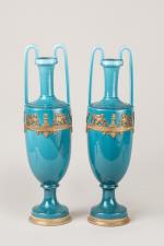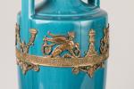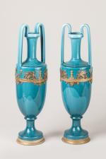 Paire de VASES fuseau en porcelaine bleu turquoise à montures en métal doré à décor de sphinges, pots à feu et cornes d'abondance,