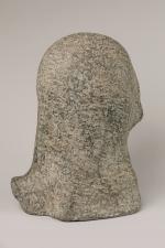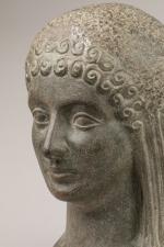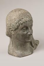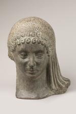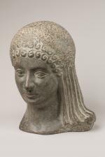 D'après l'école ANTIQUE Tête de jeune femme. Ciment teinté. Hauteur : 32,5 cm. Largeur : 23,5 cm. Profondeur : 23 cm.