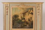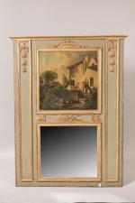 MIROIR de TRUMEAU en bois mouluré et sculpté d'ornements dorés sur fond gris tels que pot à feu, rangs de perles, feuillages rubanés, trophée de flèches et flûte. Foncé d'une glace en partie basse, il reçoit une huile sur toile figurant une femme à ses travaux devant un moulin à eau en partie haute.