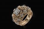 BAGUE dôme en or jaune centrée d'un DIAMANT d'environ 0,65 carat dans un entourage à motif ajouré de fleurettes centrées de BRILLANTS.