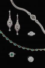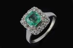 BAGUE de forme rectangulaire en or gris et platine ornée d'une EMERAUDE taille émeraude dans un entourage de douze DIAMANTS brillantés.