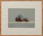 Pierre JACQUELIN (1944)Nature morte aux prunes et à la boîte de thé.Pastel signé en bas...